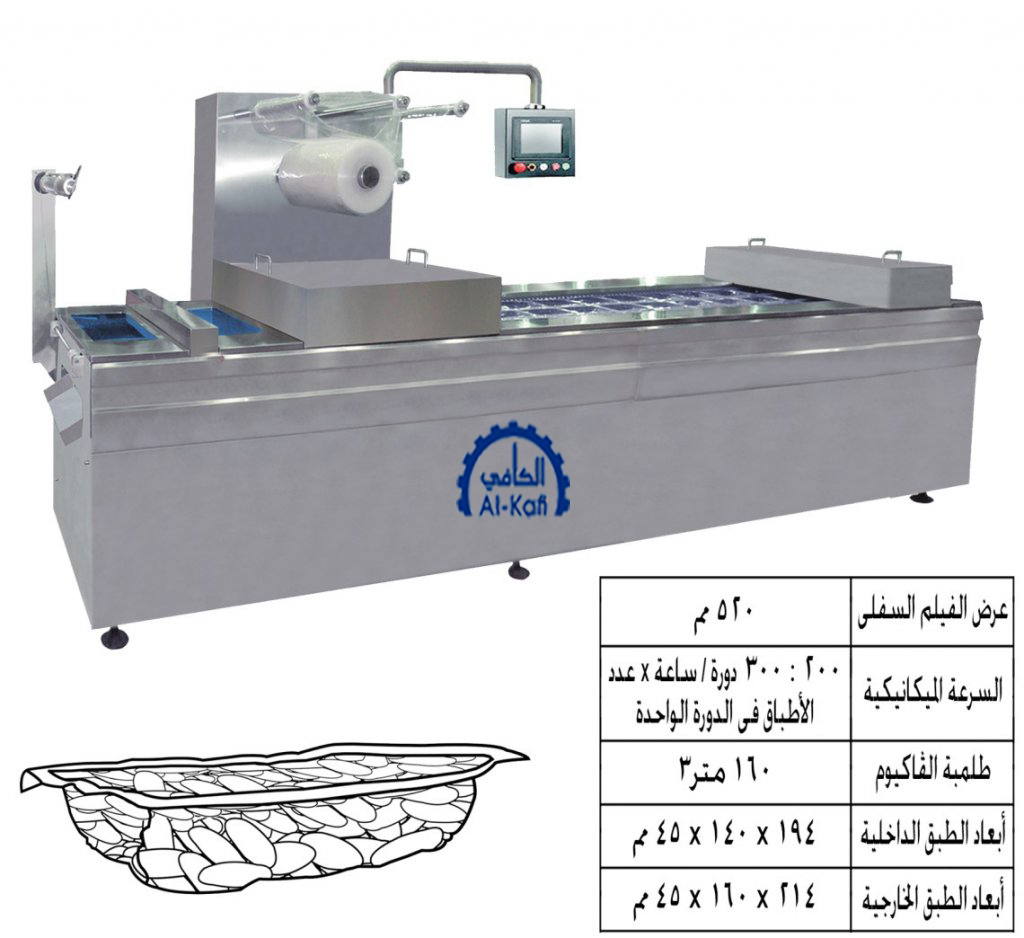 مزود بوحدة تحكم إلكترونى PLC ماركة SIEMENS– شاشة باللمس قابلة للبرمجة من الماركات العالمية – جسم الماكينة الخارجى والأجزاء الملامسة للمنتج إستانليس – دورة وسلندرات الهواء من الماركات العالمية – الإنفرتر ماركة SCHNEIDERELECTRIC – مزودة بطلمبة الفاكيوم من الماركات العالمية – خلية ضوئية ( فوتوسيل ) – يستخدم الخط عدد 2 رول – الرول السفلى لتشكيل العبوة على شكل تراى – يتم تغذية المنتج يدوياً – يتم لحام العبوة من اعلى بواسطة رول علوى – يتم تفريغ الهواء من العبوة ( مرحلة الفاكيوم ) أثناء لحام العبوة – يتم فصل العبوة بعد اللحام بإستخدام كتر على شكل غطاء العبوة – يتم لف زوائد اللحام على رول مستقل – التصميم الإستاندرد للخط على أساس إنتاج عدد 3 اطباق حجم واحد كيلو جرام تقريباً فى الدورة الواحدة