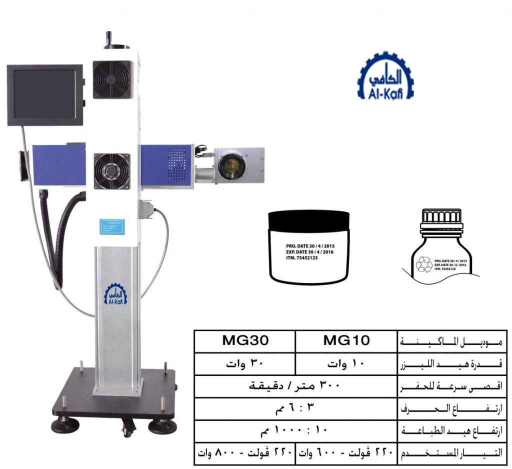 شاشة قابلة للبرمجة – غمكانية تركيب الماكينة على خطوط الإنتاج او العمل منفردة – إمكانية التحكم فى إرتفاع هيد الليزر – إمكانية دوران هيد الليزر 360 درجة – لا تستهلك احبار أو مذيبات – يمكن الحفر باللغة العربية او اللغة الإنجليزية حتى 8 سطور – الكتابة المحفورة على العبوات بواسطة الماكينة مؤمنة وغير قابلة للطمس أو المحو – فى حالة الحفر على المنتجات المعدنية – يتم الحفر على طبقة الطباعة – إمكانية حفر التواريخ والسيريال والأرقام والباتش والباركود واللوجو والرسومات